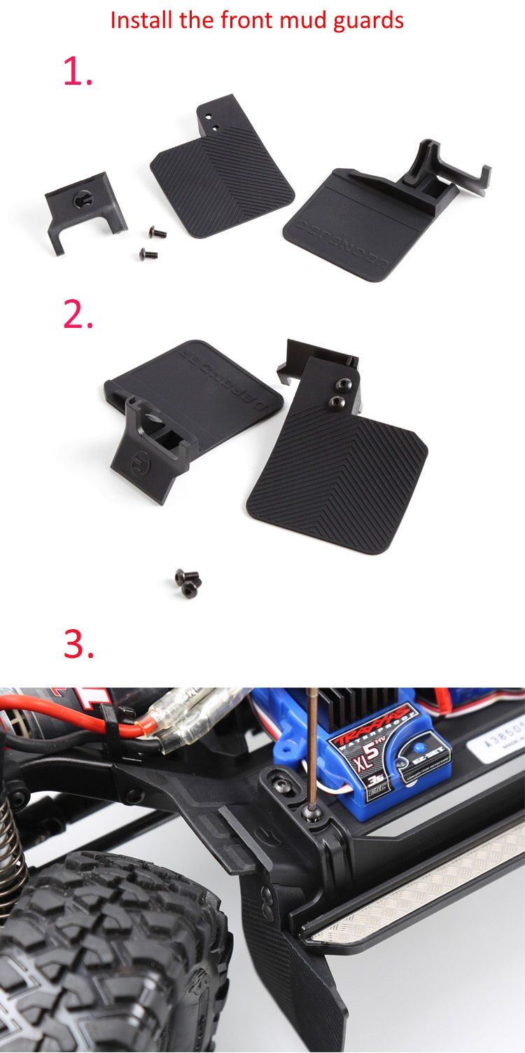 Front Mud Guard Flap x2 (Silicon Rubber: Left/Right) Rear Mud Guard Mount x2 (ABS: Left/Right) Rear Mud Guard Flap x2 (Silicon Rubber: Left/Right) M3.0X6 Screw x8 (Black) |
