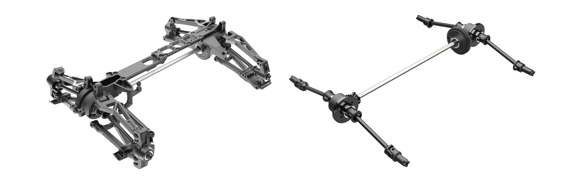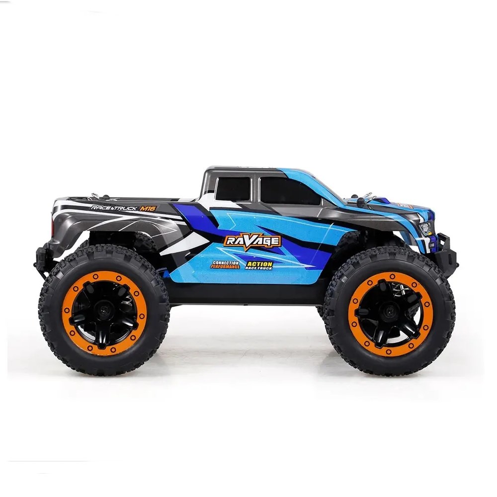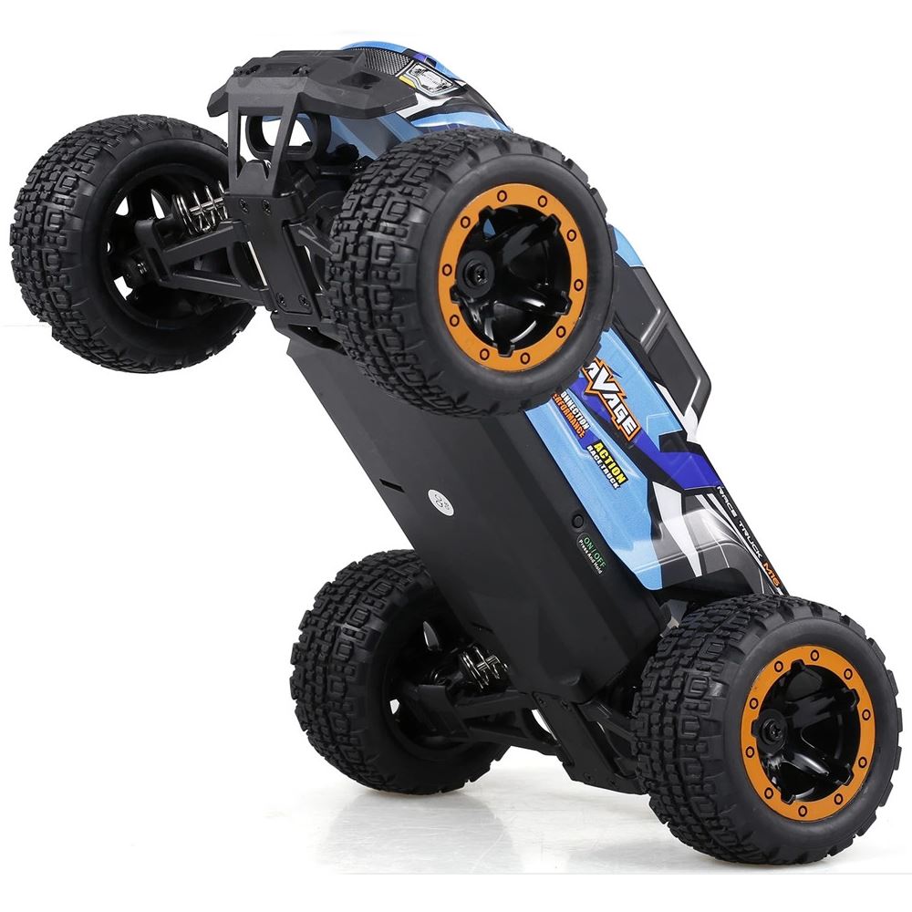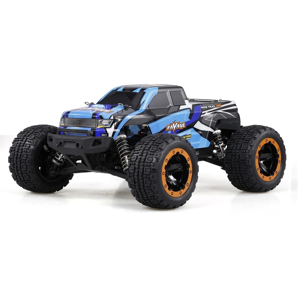 The HBX Ravage includes a durable plastic tub chassis, beefy independent suspension arms, adjustable threaded body coilover shocks, front and rear gear differentials and full time shaft driven 4WD. The large front and rear bumpers, with impact resistant mounting brackets, look good and offer protection against crashes. Pop in the included set of LED headlights for enhanced night time visibility.