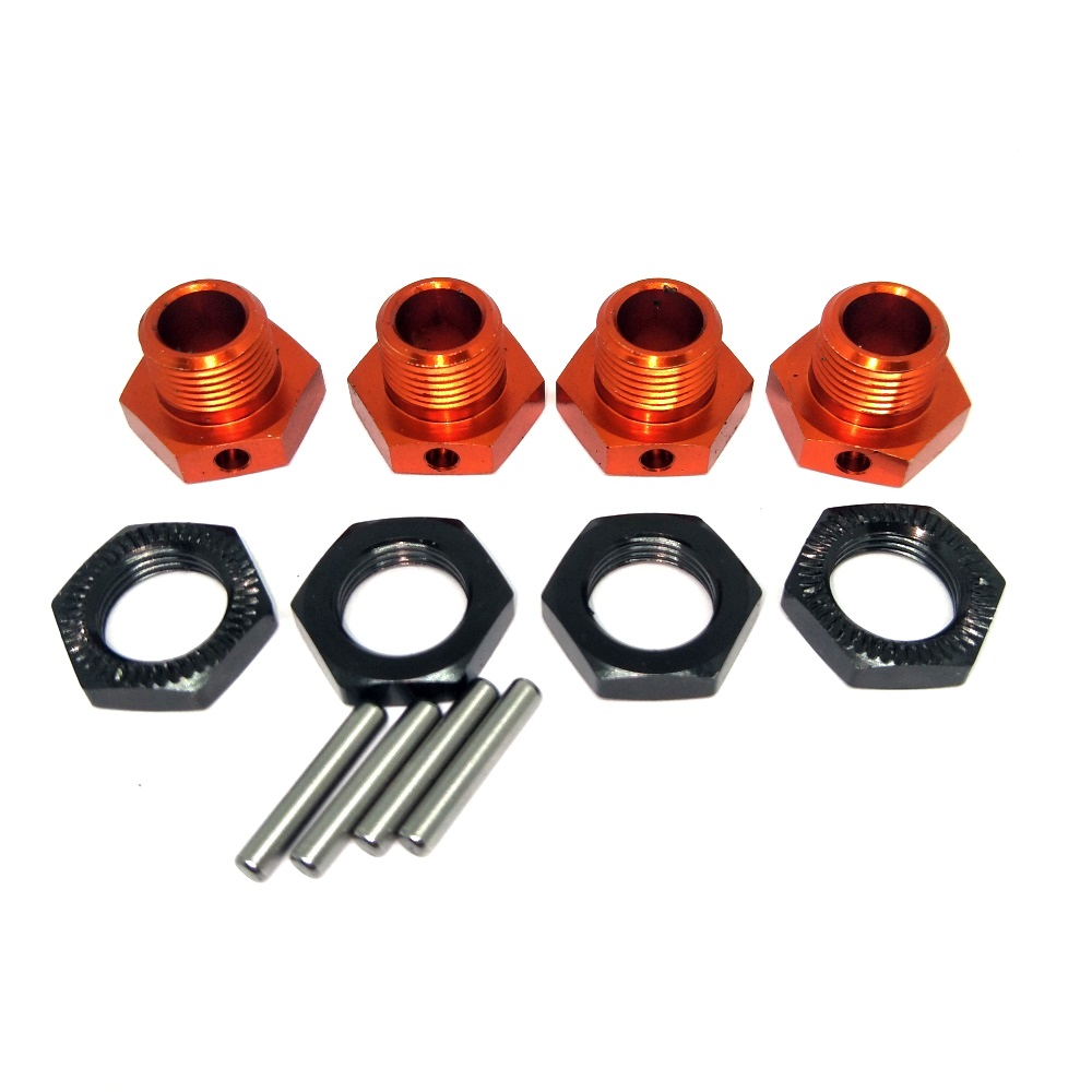 Orange Anodized Aluminum 17mm Wheel Hubs x4 Inner Diameter: 8mm Length: 13.5mm Black Wheel Nuts x4 Pin 3x17mm x4 (HPI #101082) |