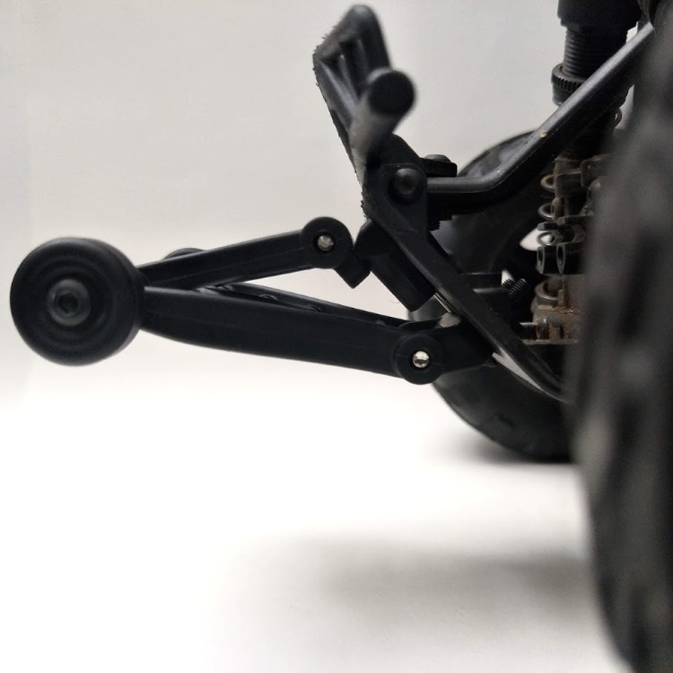 Wheelie bar options for the 1/16 mini Savage XS? The Traxxas #7184 for the mini-Revo is a good choice as its two wheels make the wheelie more stable, and you can adjust the height of the wheelie – or NO wheelie.